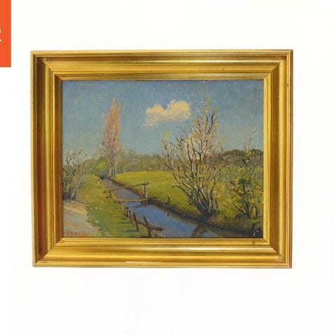 Landskabsmaleri med hestevogn og høns (str. 43x19 cm)
