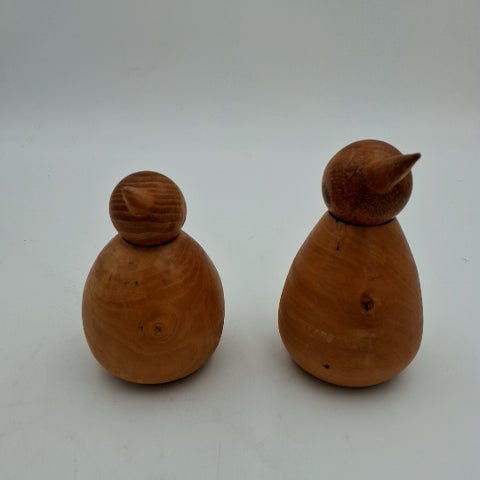 2 fugle begge velholdte i egetræ. En slank fugl (han) og en buttet fugle (hun). Begge fugle 250 kr. 1 fugl 150 kr.