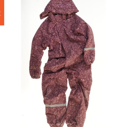 Børnevinterheldragt med et mønster i lilla og mørke nuancer. Heldragten har en pelshætte og elastiske manchetter ved ærmer og ben for en tæt pasform. Der er dobbelte lynlåse foran for nem påtagning og aftagning. Dragten har reflekser for sikkerhed i lavt lys.