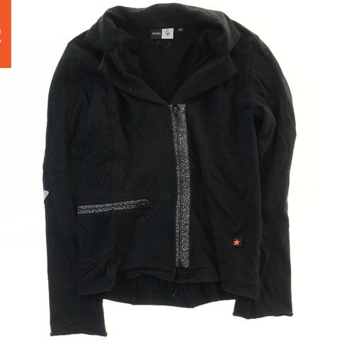 En børnejakke med et farverigt sommerfugleprint på fronten og afslutninger af sorte ærmer. Jakken har en hætte og lynlåslukning foran. Egnet til overgangsvejr.