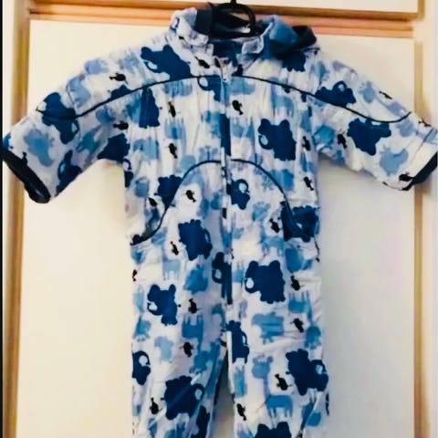 Flyverdragt med striber i sort og grå. Dragten har en hætte og lukkes med lynlås foran. Der er forstærkninger ved knæområdet og elastik ved ærmer og benslutninger.
