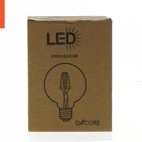 Dette er en LED pære, model G95, fra mærket DA'CORE. Pæren kommer i en papæske og har en Edison fatning. Det er designet til at give energieffektiv belysning. Pæren er synlig inde i æsken og har en størrelse på 14 cm. Den kan bruges til forskellige typer af lamper og belysning løsninger.