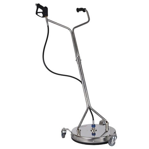 Professionel terrasserenser i rustfri stål med hjul for effektiv og nem brug. Håndtag, hjul, afskærmning mm i rustfri stål. Meget kraftig konstruktion til professionelt brug. Bør anvendes sammen med en højtryksrenser med mindst 172 bars tryk og et højt flow for at få det bedste resultat. Specifikationer: 22" / 55 cm i diameter 4 hjul i rustfri stål 3 dyser / 3 arme Diameter: 53 cm Min tryk: 172 bar/2500 PSI Max tryk: 275 bar/4000 PSI Min flow: 600 liter/time Max flow: 2400 liter/time Max temp. 100° 3/8" kobling Længde på håndtag: 150 cm Nr. AF2201
