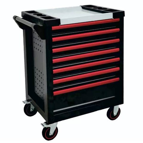 Kombineret værkstedsvogn og arbejdsbord med indbygget lys og 230 volt strømudtag. Som vores anden vogn i denne længde har denne også hulplade bagvæg og en 215 x 50 x 3,8 cm bordplade. Desuden er det i alt 10 skuffer i forskellige størrelser og 1 stort skab og håndtag til at flytte vognen rundt. Arbejdslyset styres via en indbygget sensor på den første lampe. Tænd/sluk: Bevæg en finger tæt foran sensoren for at tænde eller slukke lyset. Dæmpning: Hold fingeren foran sensoren for at regulere lysstyrken – lyset dæmpes eller øges, afhængigt af hvor længe fingeren holdes foran. Bemærk også de kraftige hjul, hvoraf 4 stk. er med bremse. Der medfølger 12 kasser til ophæng på hulpladen + 13 forskellige kroge til ophæng på hulpladen: 3 dobbelt kroge, 3 bøjle kroge og 7 enkelte kroge. Til denne vogn kan man tilkøbe ruminddelere til både de store og små skuffer. Desuden er det muligt at tilkøbe ekstra kroge til hulpladen. Se alle muligheder herunder eller ring for spørgsmål. Mål: Bredde små skuffer: 43 cm Bredde store skuffer: 95 cm Skab: 43 x 71 x 40 cm Arbejdshøjde bordplade: 95 cm Totalmål: 215 x 147 x 51 cm Pakkemål: ca. 220 x 100 x 60 cm Vægt: 150 kg 4 drejebare hjul med bremse + 2 lige hjul på midten Indbygget lys 3 x 230 volt udtag (schuko) Nr. 8009198 Stort set magen til 8005577 - se herunder