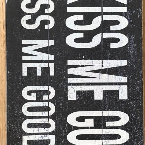Dette er et hjerteformet vægskilt lavet af træ. Skiltet har en humoristisk tekst på forsiden, og der er en illustration af en kvinde med en moppe. Teksten siger: Tør nu fødderne på måtten, ellers bliver mor knottten.
