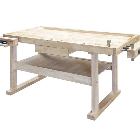 Kraftig Eminent høvlebænk/arbejdsbord til træarbejde. Minder meget om de klassiske høvlebænke man tidligere så i sløjdlokalet i skolerne. Denne model har 2 skruetvinger, skuffe og fordybning til værktøj mm i hele bænkens længde. Leveres inkl. bænkhunde i metal og træ. Bordpladen - øverste 20 mm - er i gummitræ og af andre fine detaljer kan nævnes den praktiske skuffe til opbevaring af bænkhunde, værktøj mm. Materiale bordplade: Gummitræ Bæreevne: max 150 kg Længde: 145 cm Bredde 55 cm Højde: 85 cm Vægt: 50 kg