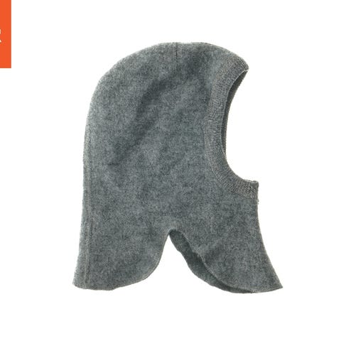 En grå hue/hjelm lavet af uldmateriale med en blød tekstur. Huen har en ribbet kant og en elastisk underdel med trykknapper, der sikrer en god pasform.
