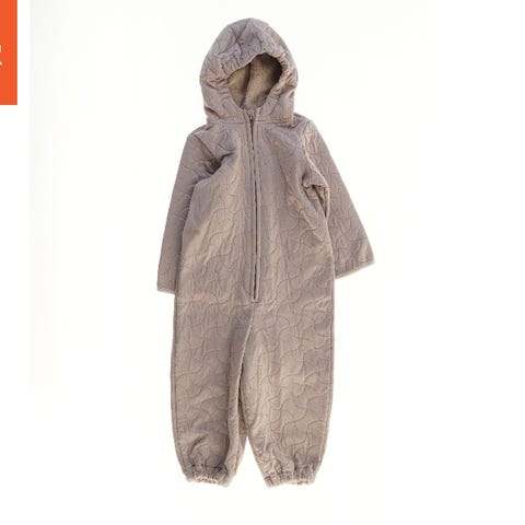 Strikket heldragt i rosa med lange ærmer og dekorative strikdetaljer med små knopper på øverste del. Der er en række knapper langs siden, der gør det nemt at tage dragten af og på.