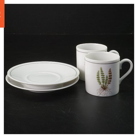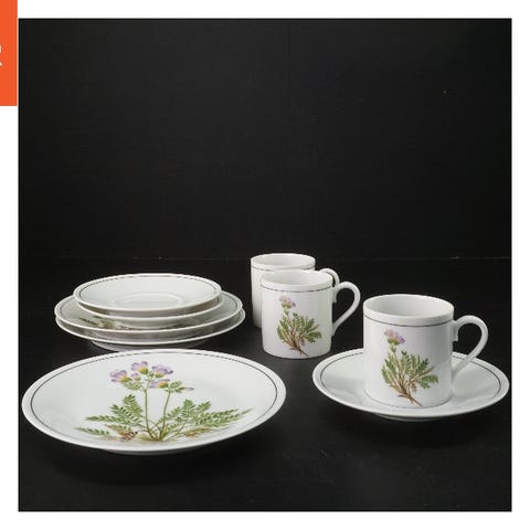 Porcelænssæt bestående af to kopper og underkopper. Kopperne har et blomstermotiv og tynde linjer langs kanterne. Underkopperne har en enkelt linje langs kanten. Alle dele er lavet af porcelæn og har en diameter på 13 cm og højde på 7 cm.