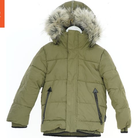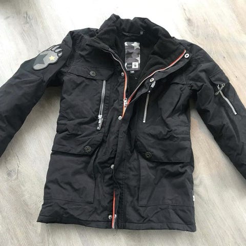 Vinterjakke fra Molo med hætte. Jakken har en lynlås foran og to lommer med lynlåse. Der er velcro på ærmerne for justering. Den farvefulde stil indeholder nuancer som orange, blå, og grøn.