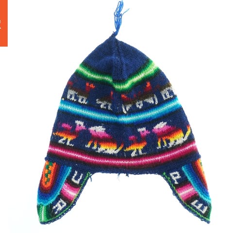 Denne børnehue har et unikt broderi design med gule zigzag linjer og hvide cirkler på forsiden. Huen er strikket i mørkegrøn farve, ideel til at holde børn varme i koldt vejr. Den ribbede kant hjælper med at holde huen på plads.