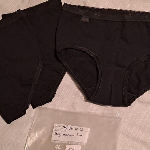 En pakke med Sloggi Luxe Maxi trusser i størrelse 44. Materialet består af 85% bomuld, 10% elastan, og 5% polyamid. Trusserne er hvide med blonde detaljer. Original emballage er med.