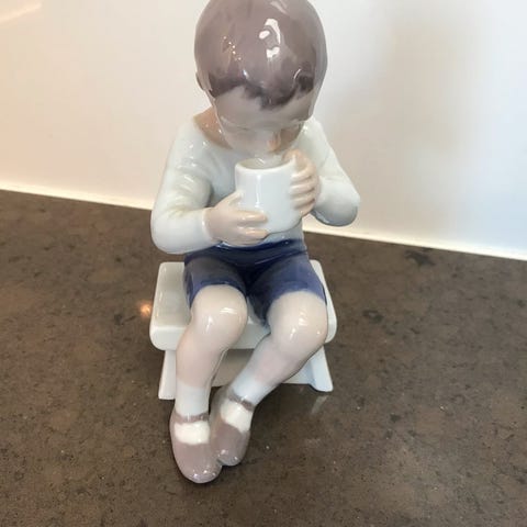 Porcelænsfigur af dreng med kop fra Bing Og Grøndal (str. 14 cm)
