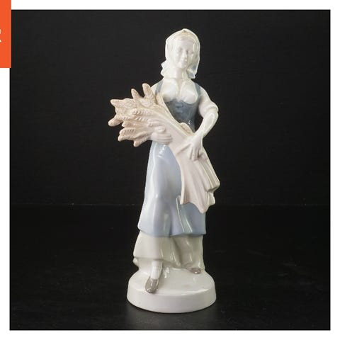 En detaljeret porcelænsfigur af en skomager, der sidder ved en arbejdsbænk. Figuren er 21 cm høj og har en base med et mærke og nummer. Skomageren er klædt i en lyseblå forklæde og har værktøjer og en flaske på bænken. Figuren er omhyggeligt malet med nuancer af blå, beige, og brune farver.