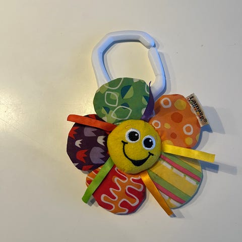 To stykker babylegetøj, der inkluderer en farverig blomst fra Lamaze og en skildpadde med rangle fra Infantino. Blomsten har forskellige farverige mønstre på kronbladene og et smilende ansigt. Skildpadden er grøn med hvid og sorte bånd, der holder tre rangler i forskellige former og farver: gul, orange og grøn. Lamaze blomsten er 23 cm i størrelse, og Infantino skildpadden er 18 cm. Begge legetøj er designet til at stimulere spædbørn med lyde og farver.