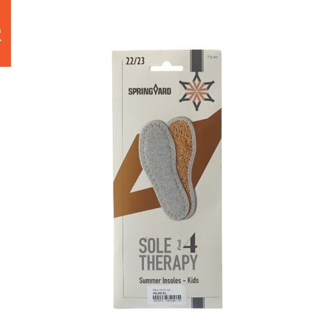 Sål til børn fra Springyard i størrelse 24-25 cm. Produktet er en del af Sole Therapy-systemet, som fokuserer på støtte, komfort, varme, og friskhed. Indersålene er lavet af bambusfrotté og kokosskum, der holder fødderne friske og komfortable.