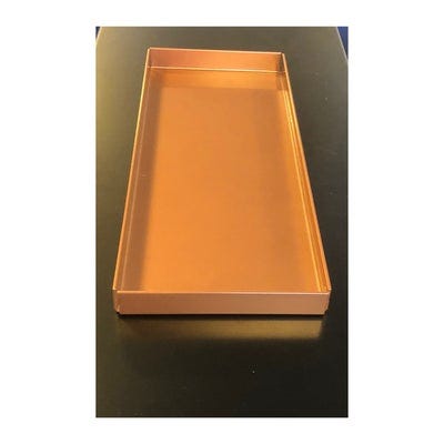 Objektet er en rektangulær metalbakke i sort. Bakken har dimensionerne 7x12x32 cm. På den ene side er der fire huller, der kan anvendes til drainage eller til montering på en overflade. Bakken er beregnet til opbevaring eller organisering af genstande og kan anvendes i forskellige indretninger, såsom køkken eller badeværelse.