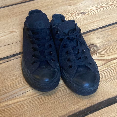 Et par sorte Converse All Star højhalsede sneakers i størrelse 39. Skoene har hvide snørebånd og en hvid gummisål. De viser tegn på brug, især på sålen og ydersiden. Logoet er synligt på siden af skoene.