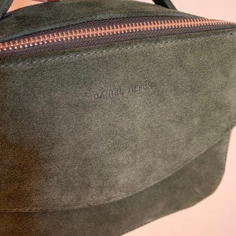 Grøn Daniel Silfen taske, 21 cm bred, 14 cm høj og 8 cm dyb. Med skulderrem. Fra røgfrit og dyrefrit hjem