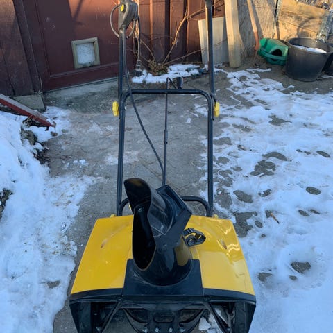 Texas Sneslynge. Maskinen er designet til effektiv fjernelse af sne fra indkørsler og gangarealer. Udstyret med håndtag for nem betjening og hjul for mobilitet.