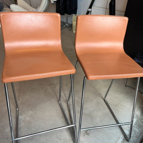 Barstolene er polstreret i imiteret læder, med sort stel der er højdejusterbare (83-108 cm), som dermed passer perfekt til både køkkenø, bar eller lign.