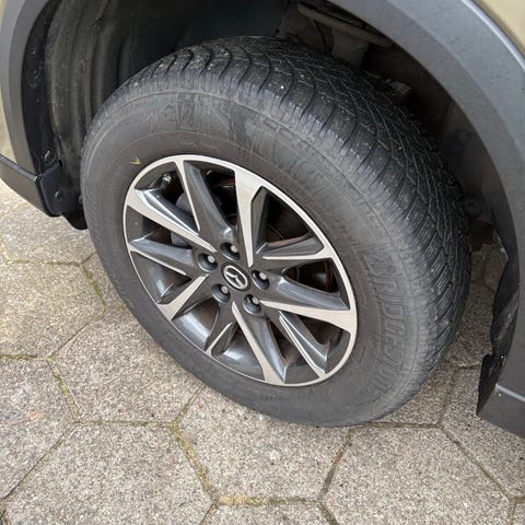 De originale Mazda alu-fælge er monteret med Firestone Winterhawk 4 fra 2024 med 7 mm resterende dækmønster.