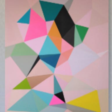 Abstrakt geometrisk maleri af Malene Hedetoft med farverige polygoner i forskellige nuancer, herunder neonpink, grøn, blå, gul og sort og kobber. MMaleriet er malet på kanten, så det ikke behøver indramning. sender gerne + fragt 250 kr. Har fravalgt fix-færdig. Tag en tur til skov og strand og kom forbi og se på maleriet. 23918466