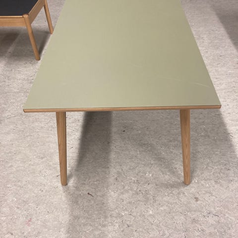 Bordpladen er i linoleum, mens ben og stel er i massivt egetræ. Linoleum er et slidstærkt naturmateriale, der er behageligt i brug og modstandsdygtigt over for pletter og mindre ridser. Bordpladen er løbende plejet med linoleumsæbe.