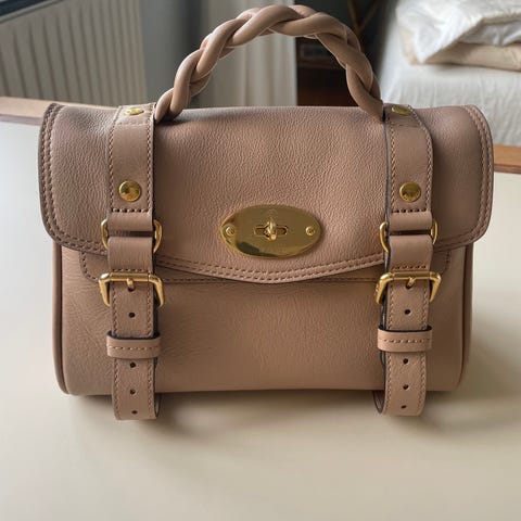 Mulberry læder taske til kvinder i lyserød farve. Tasken har en struktureret overflade med guldfarvede metalbeslag og en justerbar skulderrem. Indvendigt er tasken foret og har en lukning med drejelås.