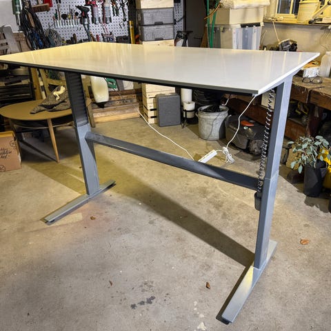 robust elektrisk hæve senke skrivebord med mahogni indfætted mosgrøn linolium arbejdsplan