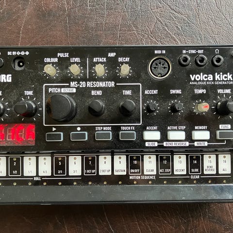 Korg Volca Sample musiksekvenser med forskellige knapper og drejeknapper til lydkontrol. En kompakt enhed til musikproduktion og lydsekvensering.