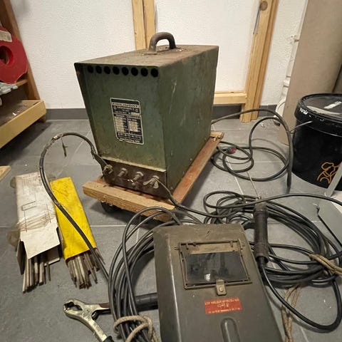 ESAB Smashweld 180 svejsemaskine med tilhørende kabler og hjul til transport. Maskinen er designet til svejseopgaver og har en robust konstruktion.