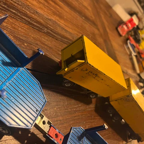 Volvo Lastbil med trailer til containere i gul og grøn farve. Modellen inkluderer en lastbil med tilhørende trailer med containere. Velegnet til samling eller leg.