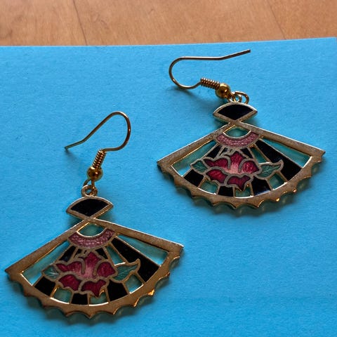 Længde 2,5 cm + 18 kt forgyldt stål ørebøjle. Cloisonne er håndlavet emalje. Øverste røde perle er rød jade.