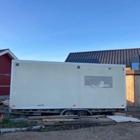 Mobil container/mandskabsvogn med integreret mødelokale og toilet. Indeholder bord med seks stole samt opbevaringsskabe. Velegnet til midlertidige arbejdspladser eller events, hvor der er behov for mødefaciliteter og sanitære forhold.