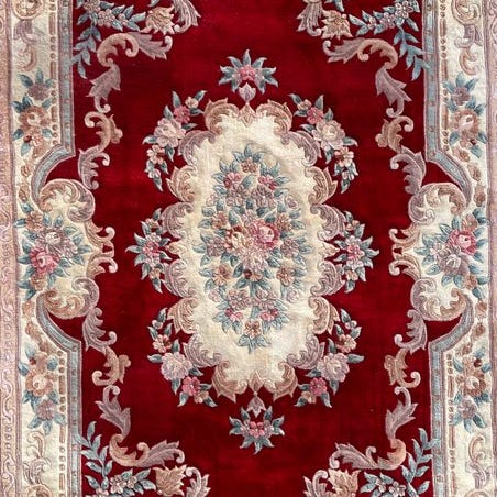 Poppy Kalas gulvtæppe, fra Layered. Mål: 180 x 270 cm. Netop renset idag af professionelle. Dog med små pletter og misfarvning (se nærbilleder). Om de kan fjernes helt ved jeg ikke. Nuanceforskellene (feks lige under det blå område) er ikke pletter, det er bare hvordan ulden lægger sig, så giver det forskellige nuancer.