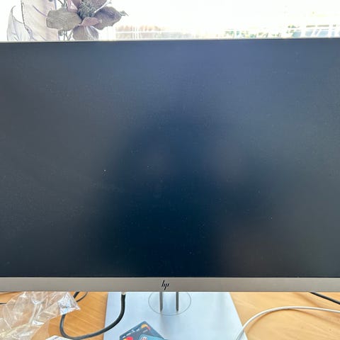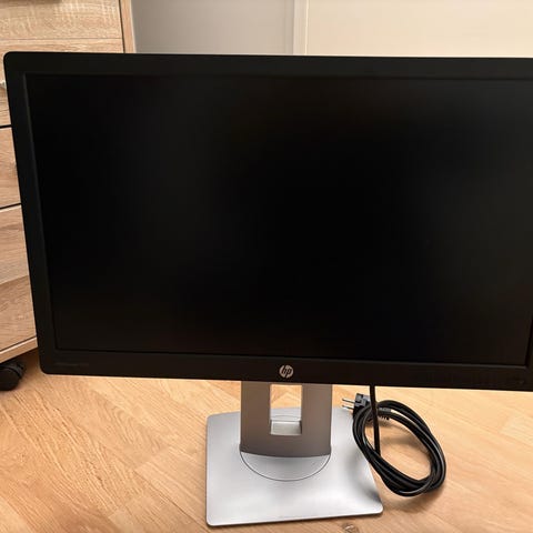 HP 24 tommer skærm med sort kabinet og rund fod. Skærmen har en skærmstørrelse på 24 tommer og leveres med tilhørende strøm- og tilslutningskabler.