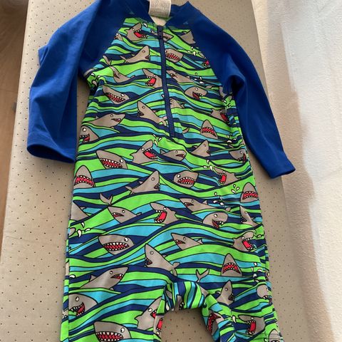 Blå baby badedragt med fisk og gobler på.