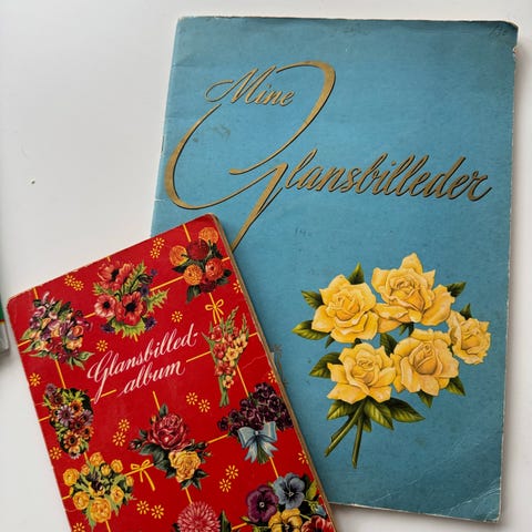 Samling af vintage glansbilleder med motiver af børn, dyr, blomster og figurer. Glansbilleder er samlet i albumbog og hele ark, med farverige og detaljerede illustrationer. Velegnet til samlere eller hobbybrug. Med og uden glimmer