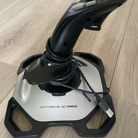 Logitech Extreme 3D Pro joystick designet til præcisionsstyring. Joysticken har flere knapper og en ergonomisk form, der understøtter brug i spil og simuleringer.