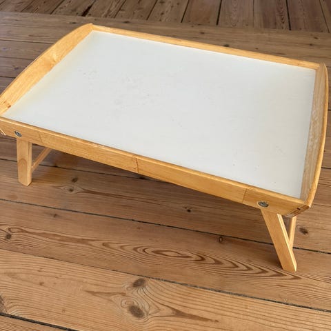Bakkebord, hvidlakeret kan bruges fx i sengen. Mål 38b x 57l x 23h.