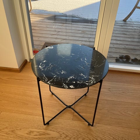 Lille bord med sort blank poleret marmor bordplade, og sort stel, ingen ridser eller afslag.