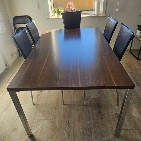 Med varierende brugsspor (mest på skænk og mellemlægspladen) som er svære at tage billeder af pga. den sorte farve mod lyset, men de kan sagtens bruges og er tunge og solide.