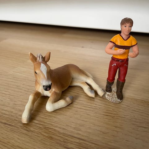 Schleich føl figur med sort sadel. Se også andre annoncer om bil/trailer, springbane og heste.