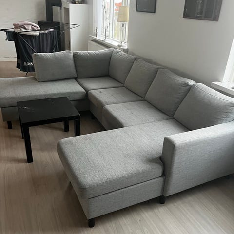 Benene er aftagelige og blir fjernet før afhentning da den eller ikke kan komme ud af min dør. De kan genskrues med en 5 mm. Unbrako nøgle. En god sofa med puf på siden der gør det nemt at vælge hvor den kan være hjørnesofa.