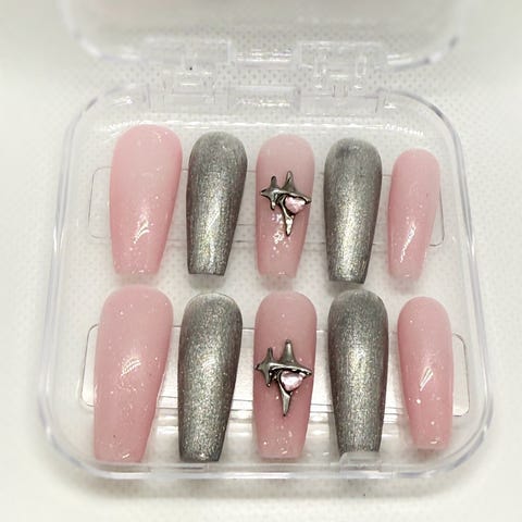 Sæt med 10 kunstige negle, indeholder: lim, orange neglebåndsstift og fil. Neglestørrelse M
