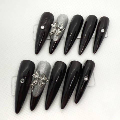 Sæt med 10 kunstige negle. Indeholder lim, en neglefil og en orange neglebåndsstift. Størrelse M