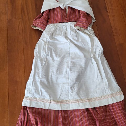 Traditionel kvindedragt bestående af flere dele: en grøn jakke med broderede detaljer (strikkede ærmer), en lang nederdel med ternet forklæde og gul kant, en hvid underskørt eller skjorte, samt en hovedbeklædning med røde og guld broderede bånd.