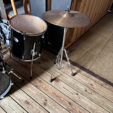 trommesæt med flere trommer og tilhørende bækkener samt trommestol. Trommesættet er sort og består af basstromme, lilletromme, tom-toms og bækkener. Sættet er velegnet til musikudøvelse og øvning. Der medfølger extra trommeskind og et extra bækken.