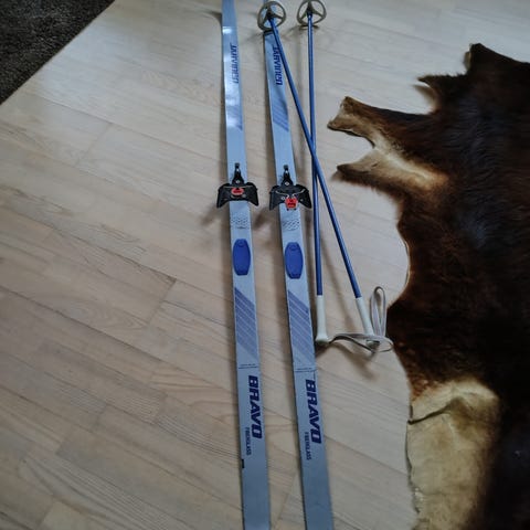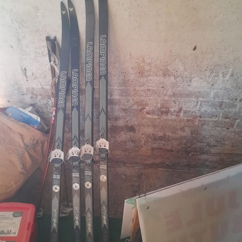 Forskellige ældre ski. Giv et bud hvis du kan bruge noget. Ved ikke noget om dem. Ca. længde. Fra venstre. 184 cm. 160 cm. 145 cm. 160 cm. Tror nr 2 fra venstre er alpin. Resten langrend.